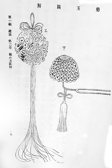 Il Sage-kusudama realizzato da Yasuterukyo era decorato con 7 tipi di Tsumami-zaiku: foglie autunnali, peonie, fiori di ciliegio, di pruno, di tachibana (mandarino), crisantemi, azalee satsuki (con profumo all'interno) e 12 nappe con cinque colori (rosso, blu, viola, giallo e nero).