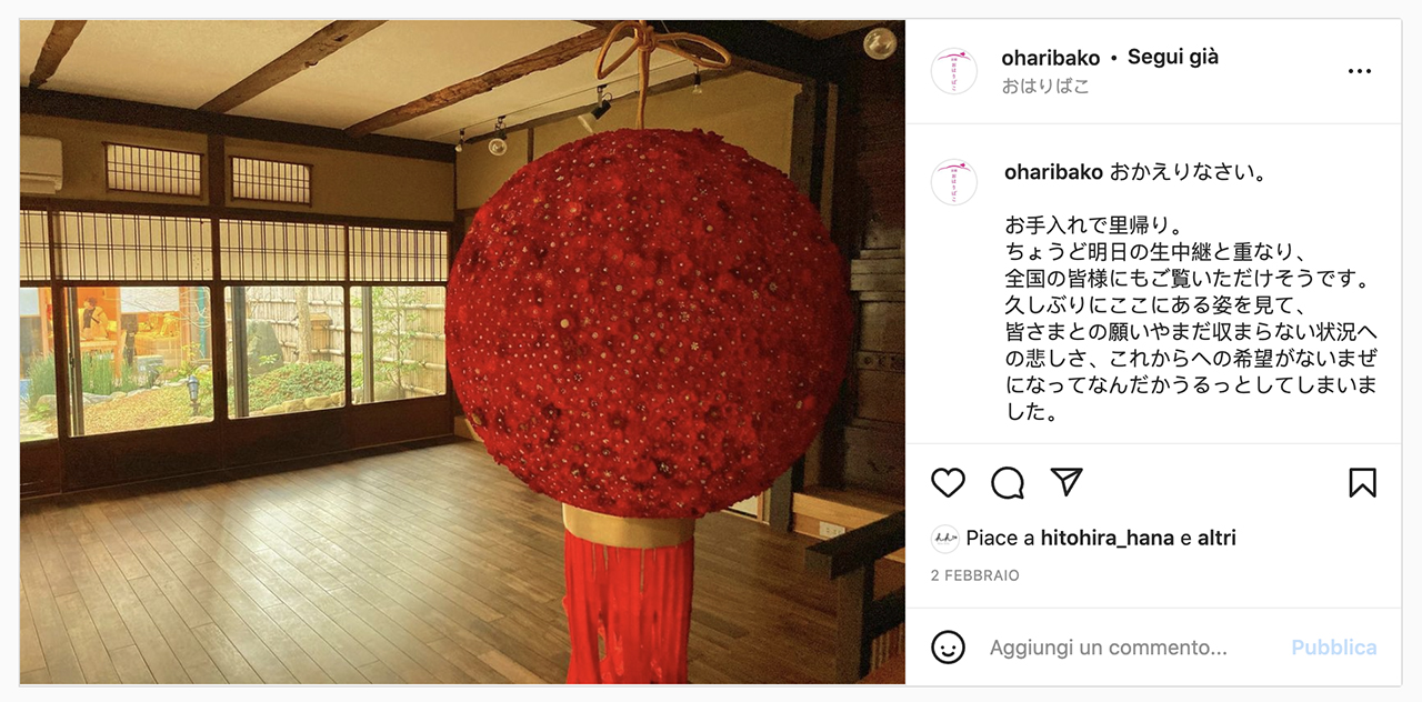 Il progetto seguente fu un grande Sage-kusudama, una decorazione che esiste in Giappone fin dai tempi antichi. È costituito da una sfera composta da strisce di bambù, impreziosita da fiori freschi.