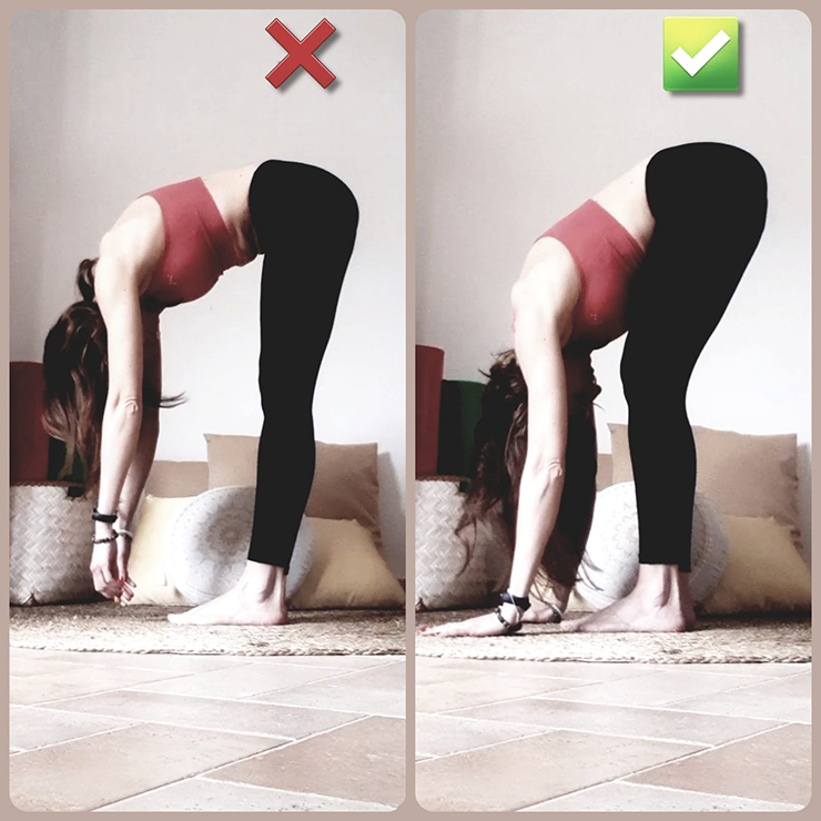 Per esempio in Uttanasana, il piegamento in avanti stando in piedi, se non riesci a toccare le punte dei tuoi piedi (tenendo le gambe dritte), inizia con il piegare le ginocchia. Non avere fretta di raggiungere la perfezione in un’asana, ma osserva i cambiamenti che arriveranno tentativo dopo tentativo, giorno dopo giorno.