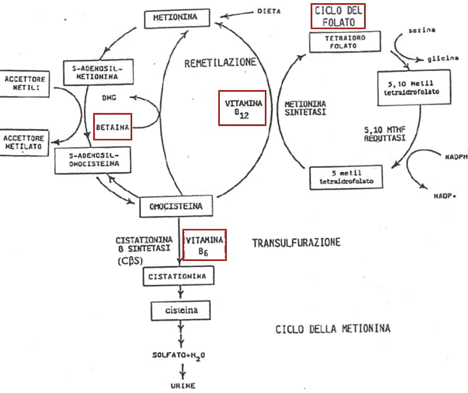 La rimetilazione dell'omocisteina in metionina richiede donatori di gruppi metilici come il 5-metil-tetraidrofolato, la vitamina B12 e la Betaina. In condizioni di carenza di folati e vitamina B12, la Betaina assume quindi un ruolo essenziale: è l’unica molecola che può trasferire un gruppo metile all’omocisteina, mantenendo così attivo il ciclo della metionina.»
