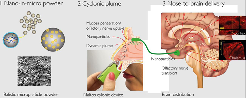 Nel particolare caso del CBD, in Nanomerics stiamo esplorando la somministrazione nasale. Infatti, siamo in grado di produrre una polvere con particelle che hanno dimensioni del micrometro, che può essere utilizzata sotto forma di spray nasale. Una volta che le microparticelle si trovano a contatto con il muco, si disintegrano in particelle più piccole, che possono penetrare la mucosa nasale, favorendo il rilascio di CBD nel cervello.»
