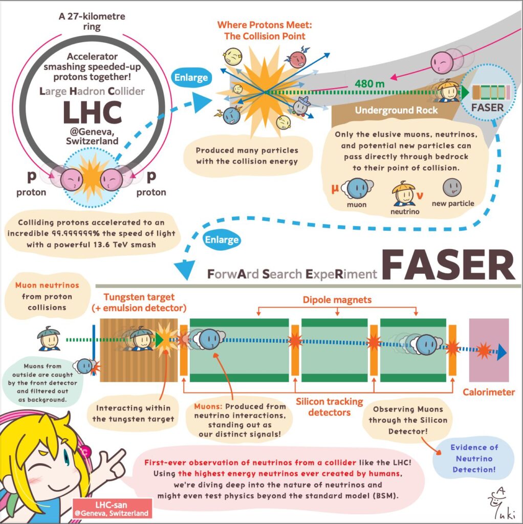 In LHC, due fasci di protoni vengono accelerati a fino ad ottenere una velocità grande quasi quanto quella della luce e, una volta raggiunta, i protoni vengono fatti collidere uno contro l’altro. Questa collisione produce tutta una serie di particelle che saranno poi rilevate e analizzate dai grandi rivelatori presenti lungo la circonferenza di LHC. Tuttavia, alcune di queste particelle, le più elusive come ad esempio neutrini, muoni e potenziali nuove particelle ancora sconosciute, si nascondono ai normali detector e attraversano la materia in direzione lineare, per essere poi intercettate da FASER.